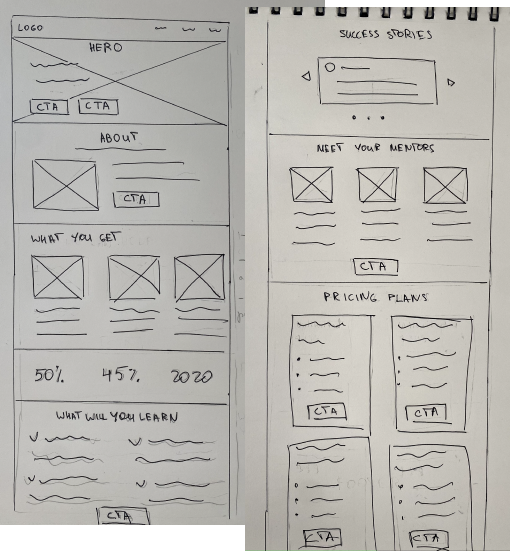 I started with sketching ideas for a desktop version. I made sure to follow a standard informational hierarchy: about, what’s in it, mentors, prices, and reviews.