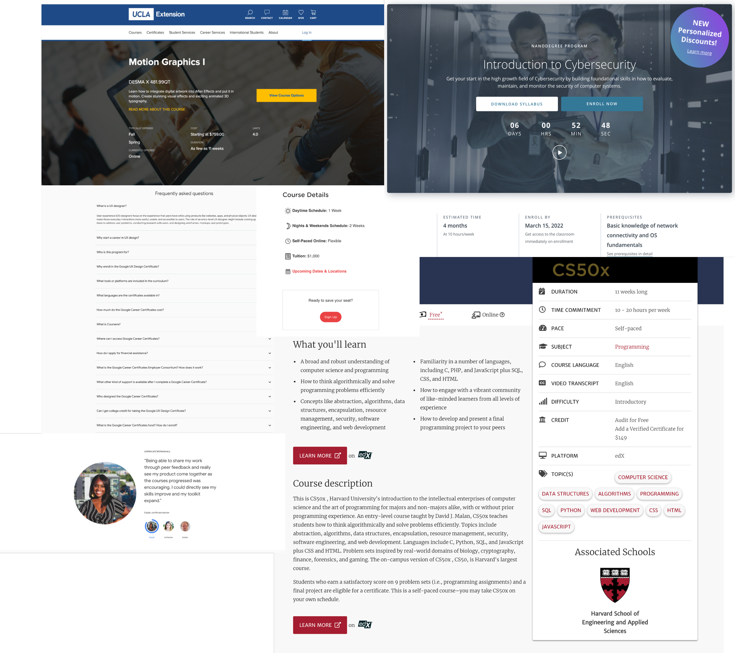 However, to understand the specifics of page architecture and what information the users expect to find I conducted my own research of 12 websites (online courses, boot camps, universities, mentorship programs) and from there identified the trends: