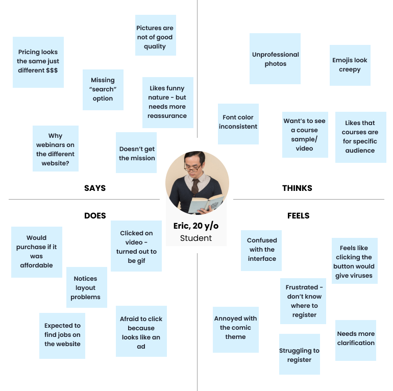 Low course purchase rates prevent Super Purposes from becoming a sustainable business that generates income. Early UX research initiatives uncovered inconsistency across the website; users found SP’s unconventional approach unprofessional and had doubts about credibility as the website lacked detailed information and appeared outdated.
